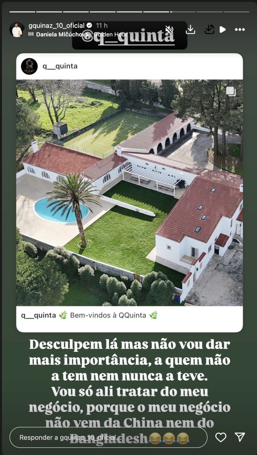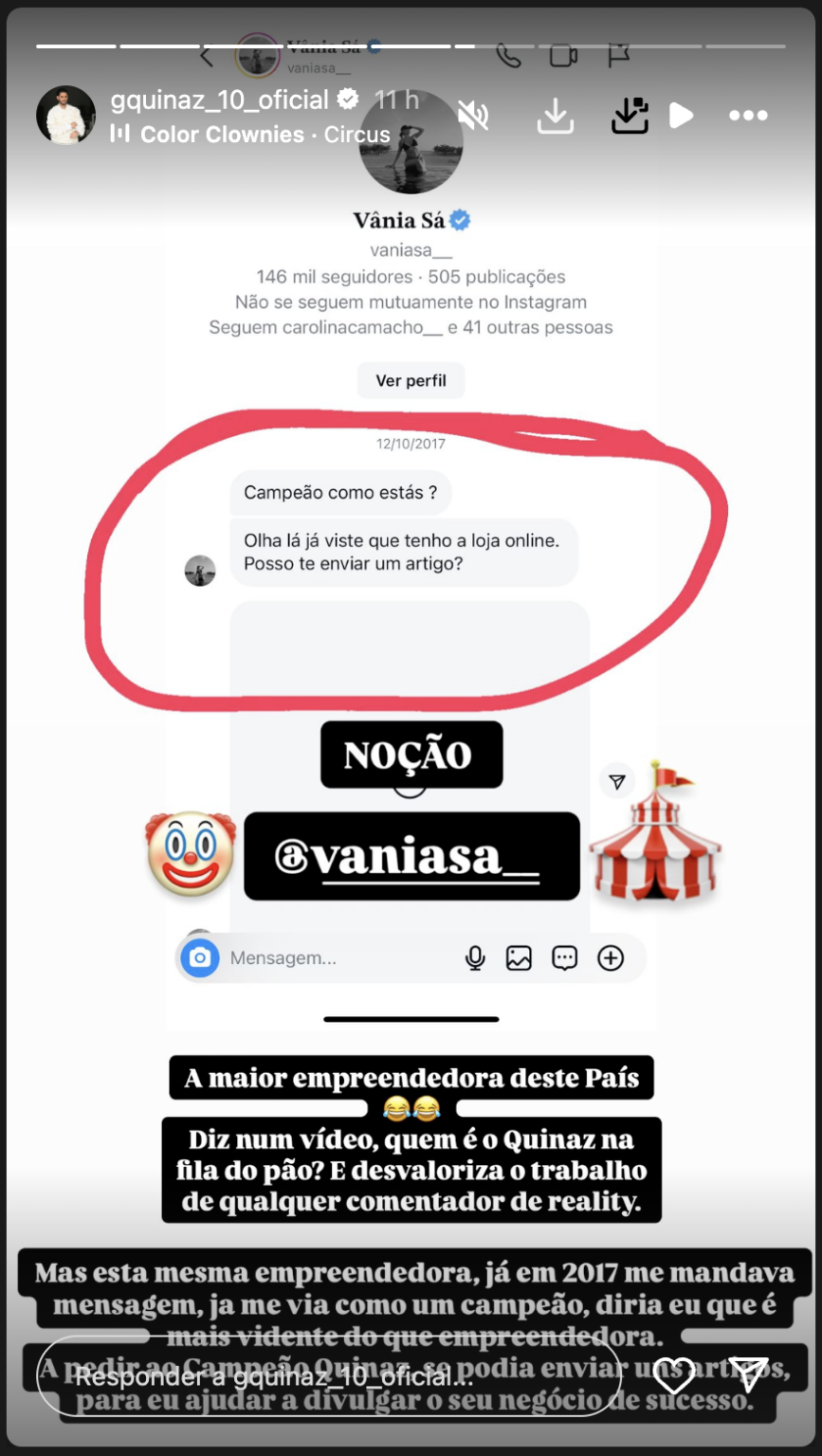 Através do seu Insta Stories, Gonçalo Quinaz partilhou uma mensagem da concorrente enviada em 2017: “Noção. A maior empreendedora deste País diz num vídeo “quem é o Quinaz na fila do pão?”. E desvaloriza o trabalho de qualquer comentador de reality”.