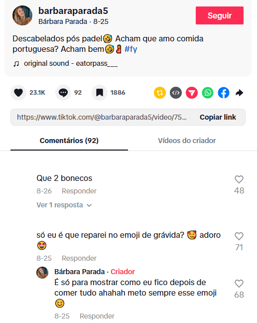 No TikTok, Bárbara lançou-se num desafio ao lado de Francisco: abrir os olhos sempre que surgisse uma iguaria portuguesa irresistível. O vídeo arrancou gargalhadas e, na legenda, a influenciadora deixou claro o seu entusiasmo: “Descabelados pós padel 🤣 Acham que amo comida portuguesa? Acham bem 🤣🤰”.