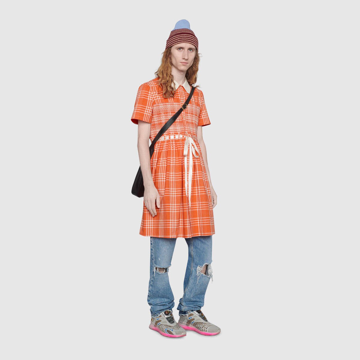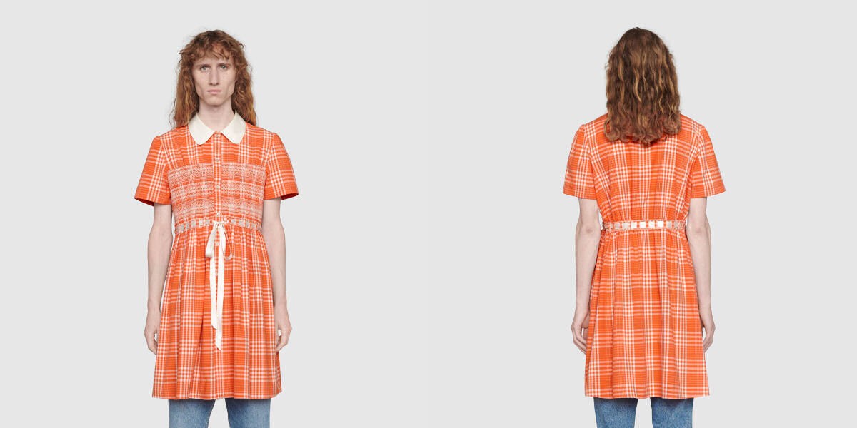 A marca italiana de artigos de luxo “Gucci” lançou um vestido em tons de laranja e bege para homem como parte da sua coleção outono-inverno.