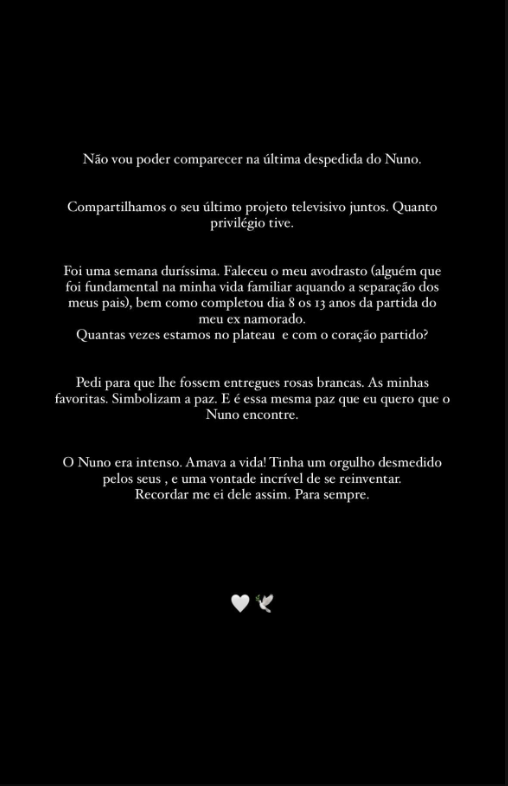 A antiga concorrente do “Big Brother” revelou ainda que pediu para que lhe fossem entregues rosas brancas, as suas favoritas, como forma de simbolizar a paz. “E é essa mesma paz que quero que o Nuno encontre”, emocionou-se.