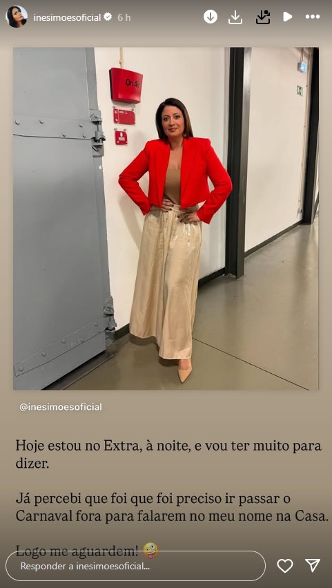 Face às declarações, Inês Simões decidiu reagir publicamente nesta quarta-feira, dia 5 de março. Através das suas stories no Instagram, a comentadora anunciou que vai marcar presença no ‘Extra’, depois de ter estado ausente do país, uma vez que viajou até à Geórgia.