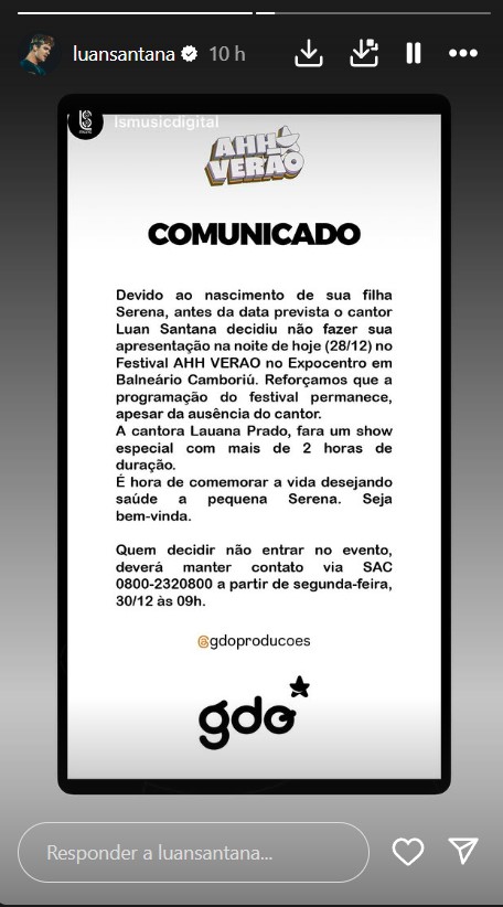 Luan também usou a ocasião para informar que precisou cancelar um concerto no Brasil para poder estar com Jade e a filha neste momento único.