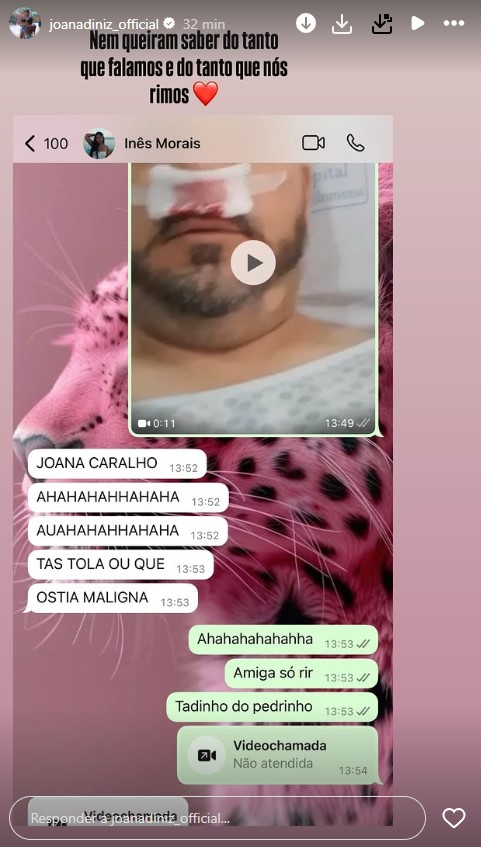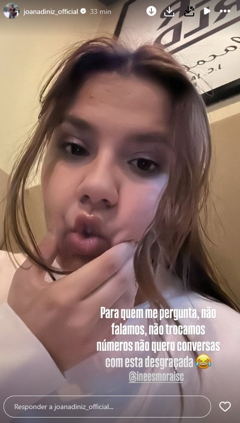 A influenciadora fez uma publicação a brincar com a situação: “Para quem me pergunta, não falamos, não trocamos números, não quero conversas com esta desgraçada.” No segundo story, Joana acrescentou: “Nem queiram saber do quanto falámos e nos rimos!”