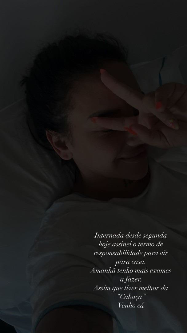 Após partilhar imagens onde surge hospitalizada, a mesma referiu:  “Internada desde segunda, hoje assinei o termo de responsabilidade para vir para casa. Amanhã tenho mais exames a fazer. Assim que estiver melhor da ‘cabaça’, venho cá”.