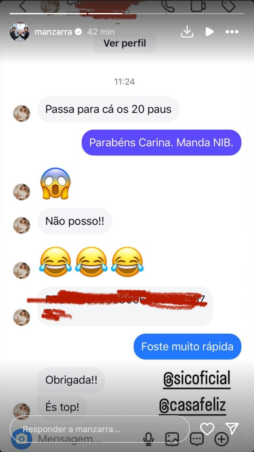 Com o seu humor contagiante, João Manzarra lançou um desafio aos espetadores do programa ‘Casa Feliz’: “Vou oferecer vinte euros a alguém da Casa Feliz. Basta enviar uma mensagem pelo Instagram a dizer: ‘Manzarra, passa para cá os 20 paus’. O primeiro a enviar, ganha! Juro!” Foi uma verdadeira loucura nos bastidores com tantas mensagens a chegarem rapidamente.