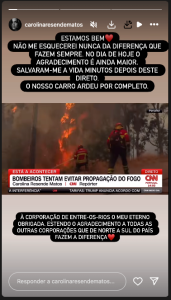 Após sublinhar a importância dos Bombeiros, a jornalista revelou que o automóvel da equipa de reportagem foi consumido pelas chamas: “Salvaram-me a vida minutos depois deste direto. O nosso carro ardeu por completo”, constatou.
