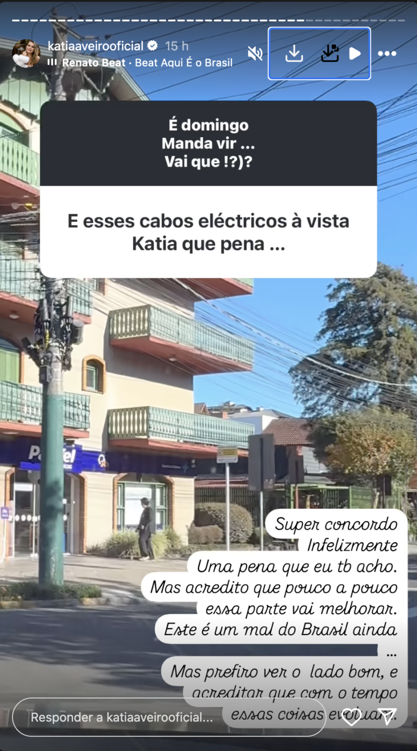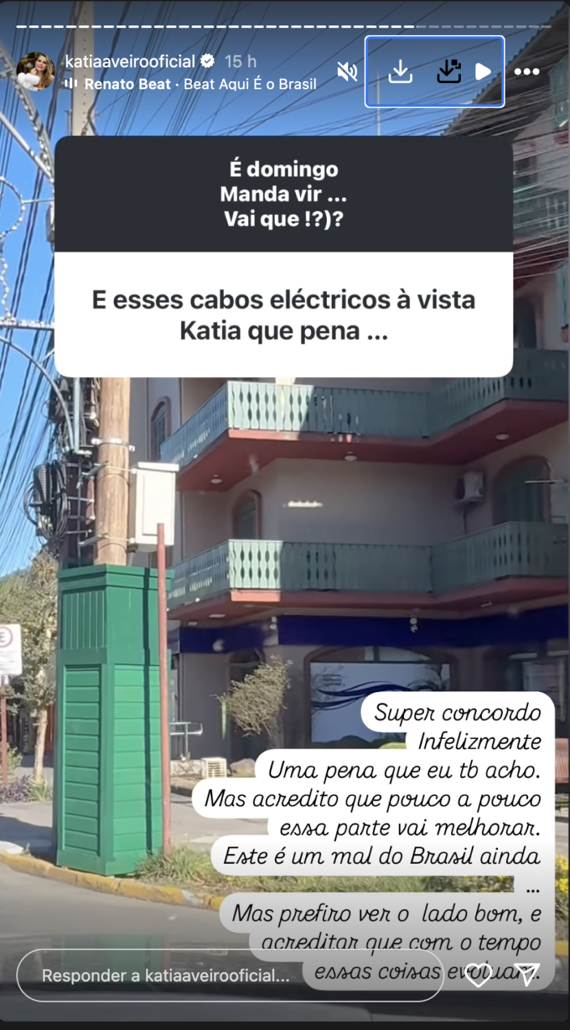 Num dos vídeos que partilhou, a irmã de Cristiano Ronaldo mostrou uma das ruas de Gramado, no Brasil, o que despertou a atenção de um internauta. Este comentou, referindo-se aos cabos elétricos à vista: “E esses cabos elétricos à vista, Katia, que pena”.