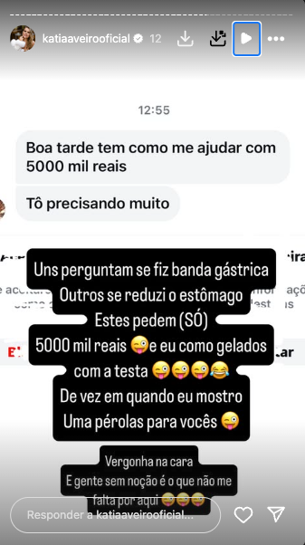 Primeiro, foi um pedido direto: alguém pediu-lhe 5 mil reais (!) como se fosse a coisa mais normal do mundo. Katia respondeu com ironia: