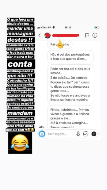 Katia Aveiro não se deixou ficar. A madeirense partilhou a mensagem através do seu InstaStories e, de seguida, respondeu sem papas na língua. O que leva um chulo destes a mandar uma mensagem destas?, começou por dizer. “Realmente existe tanta gente triste e frustrada. Mas dar a cara e ter a conta desbloqueada é que não. Coitadinho. Que pena tenho da tua família por ter tão triste ser humano na vida deles”, terminou por escrever.
