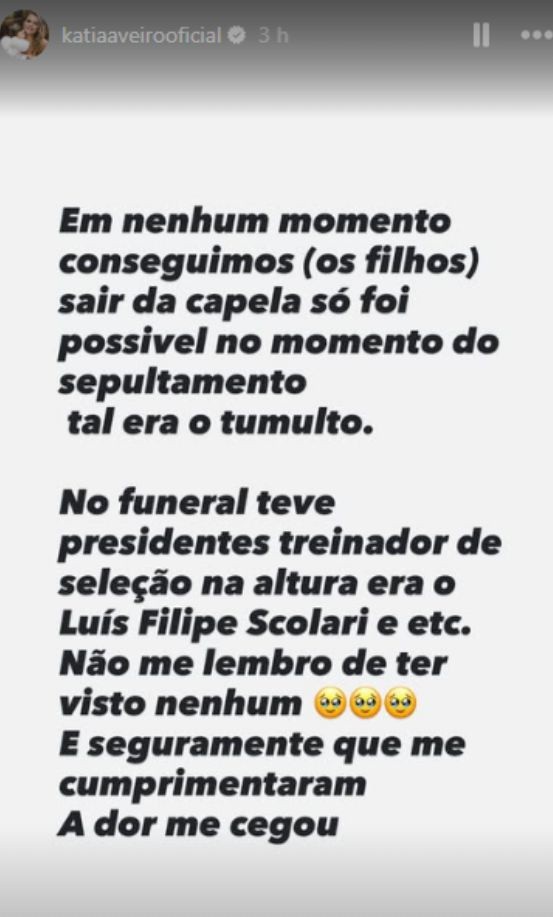 Sobre a morte do pai, José Diniz Aveiro, Kátia lembra que “o funeral contou com a presença de presidentes, do Selecionador Luiz Felipe Scolari. Não me lembro de ter visto nenhum. Seguramente cumprimentaram-me, a dor cegou-me. Além da dor da perda, tivemos de lidar com uma enchente de câmaras e curiosos no cemitério. Foi uma destruição total num cemitério nunca antes vista, sem respeito nenhum, e não era para prestar homenagem, como devem calcular. Nunca irão saber o que significa até passarem pelo mesmo”, atira.