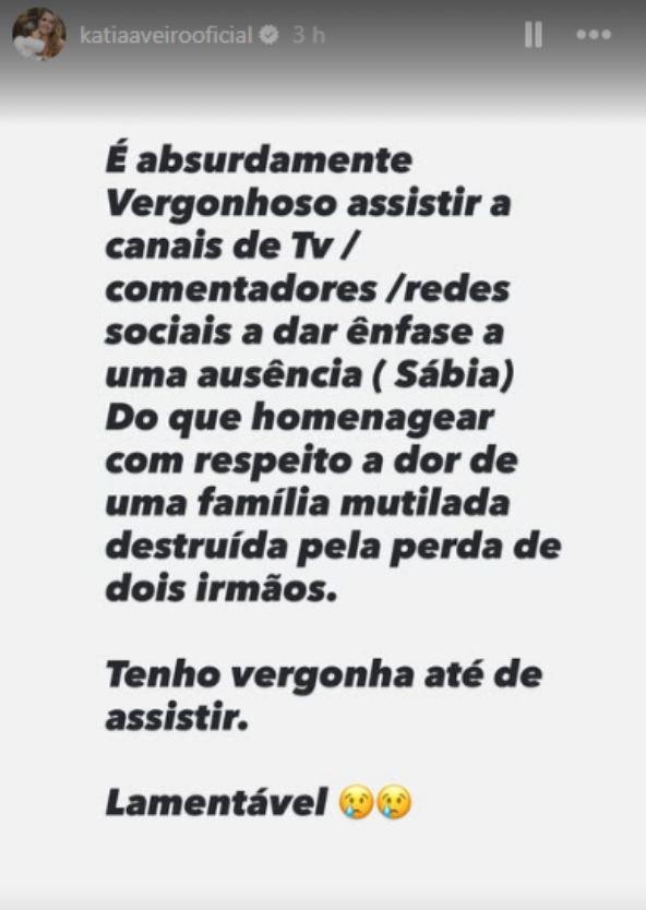 “É absurdamente vergonhoso assistir a canais de TV, comentadores e redes socais a dar mais ênfase a uma ausência (sábia) do que a homenagear com respeito a dor de uma família destruída pela perda de dois irmãos. Lamentável”, refere.