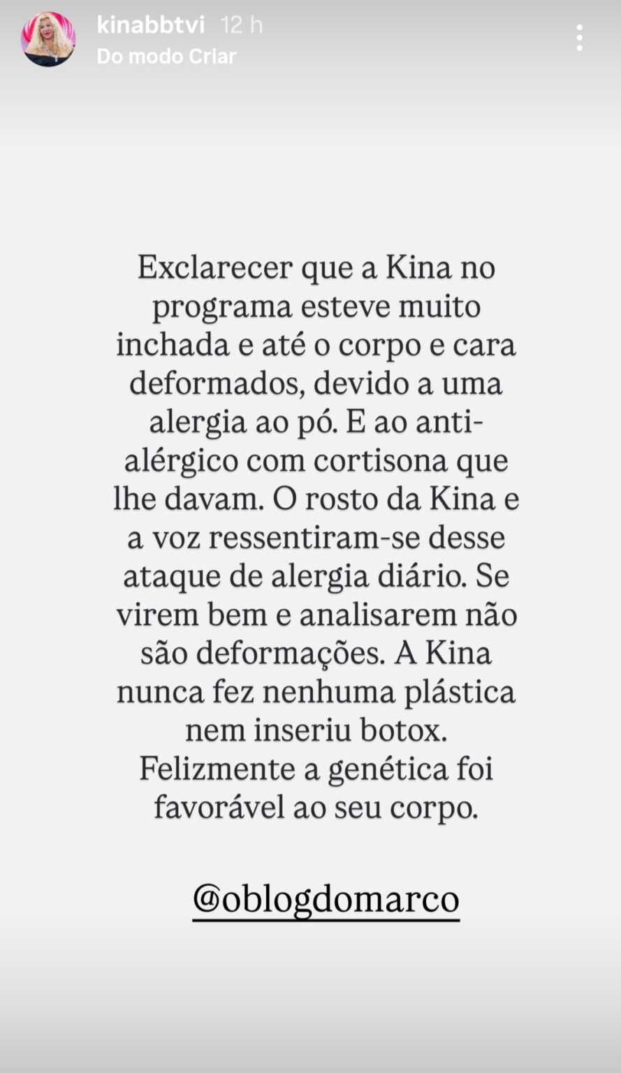 “Esclarecer que a Kina, no programa, esteve muito inchada e até o corpo e cara deformados, devido a uma alergia ao pó e ao antialérgico com cortisona que lhe davam. O rosto da Kina e a voz ressentiram-se desse ataque de alergia diário“, pode ler-se.