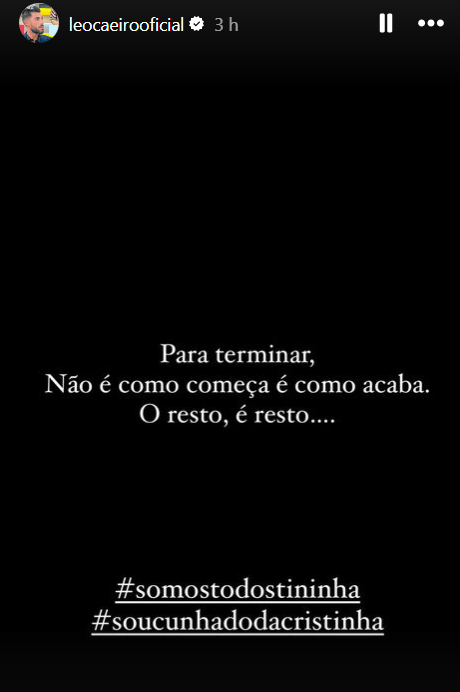 E como se isso não bastasse, o Léo ainda mandou uma indireta daquelas tanto para o Francisco como para a Cristina Ferreira. Ele disse assim: “Para terminar, não é como começa, é como acaba, o resto é resto… #somostodostininha #soucunhadodacristinha”.