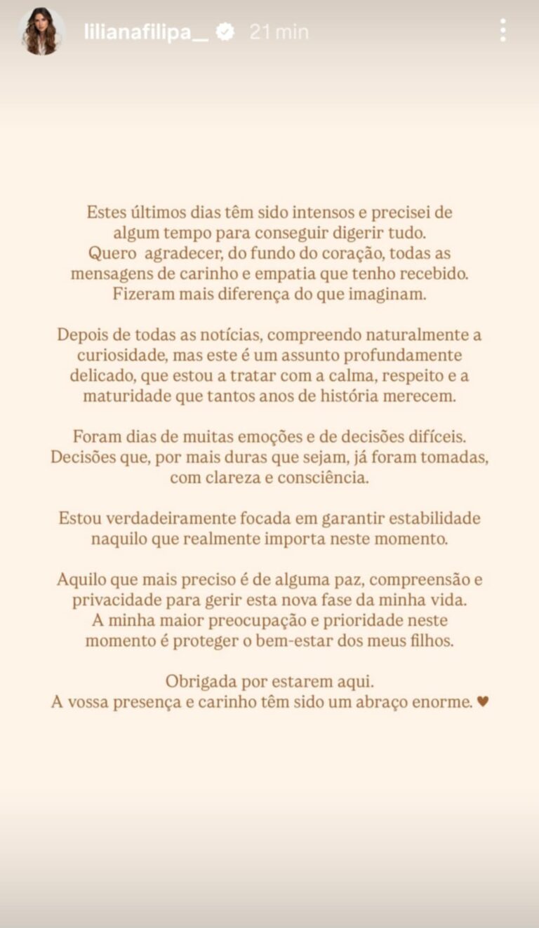 Foi através de um desabafo sentido no Instagram que Liliana Filipa falou, esta quinta-feira, 13 de novembro, sobre o turbilhão emocional que tem vivido desde que circulou o vídeo de Daniel Gregório a beijar outra mulher numa discoteca de Lagos.