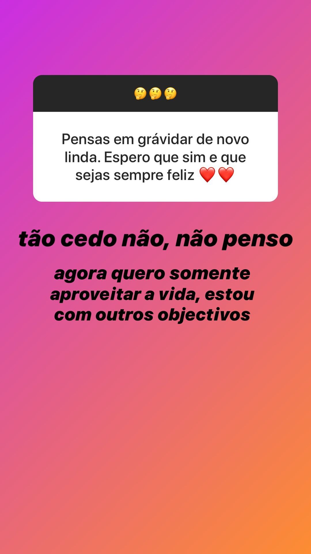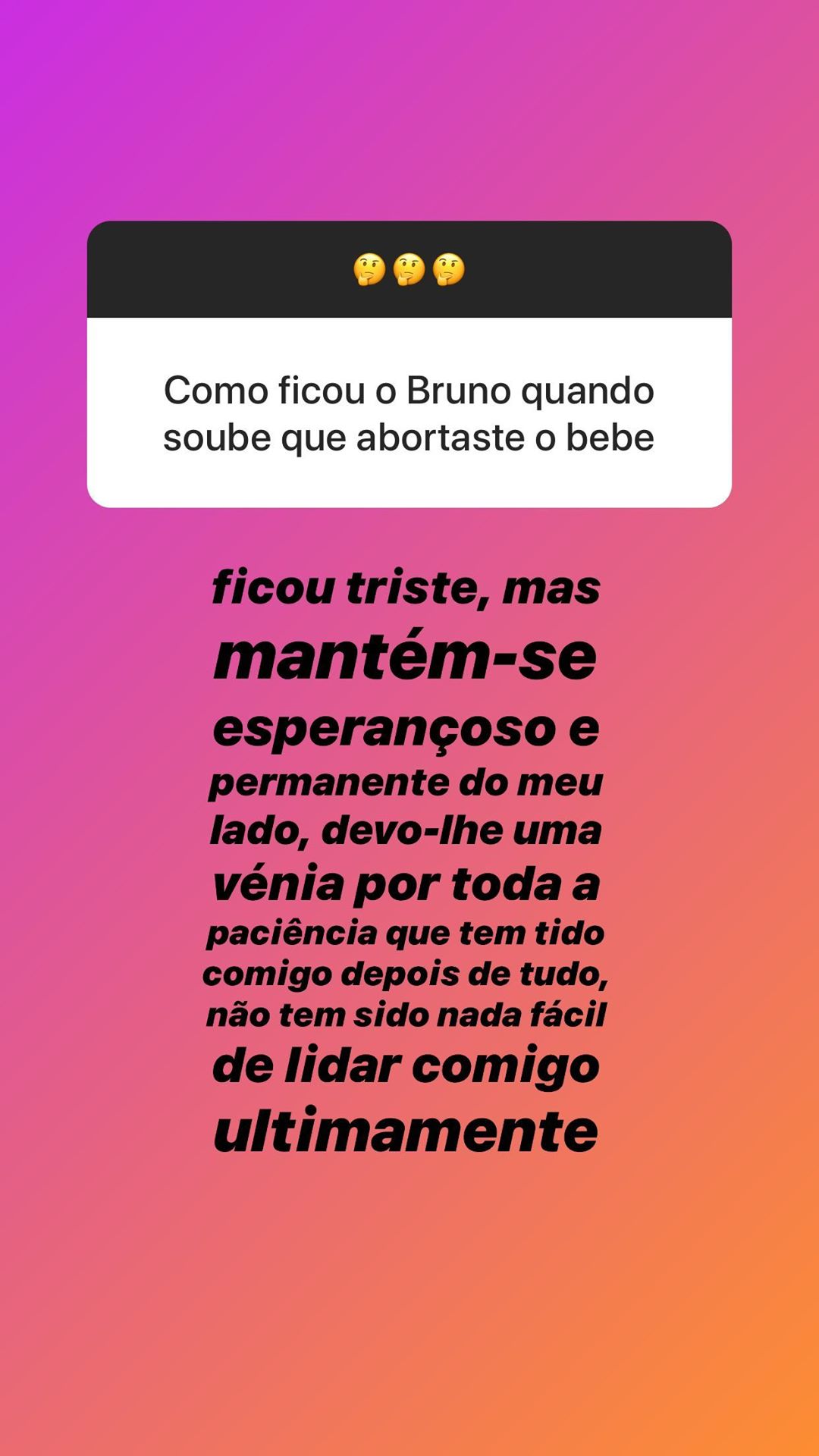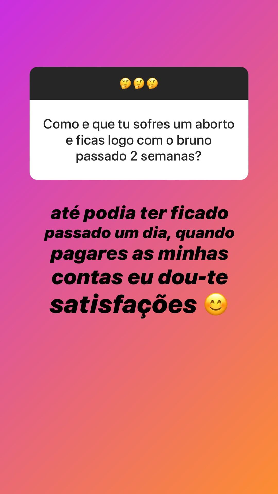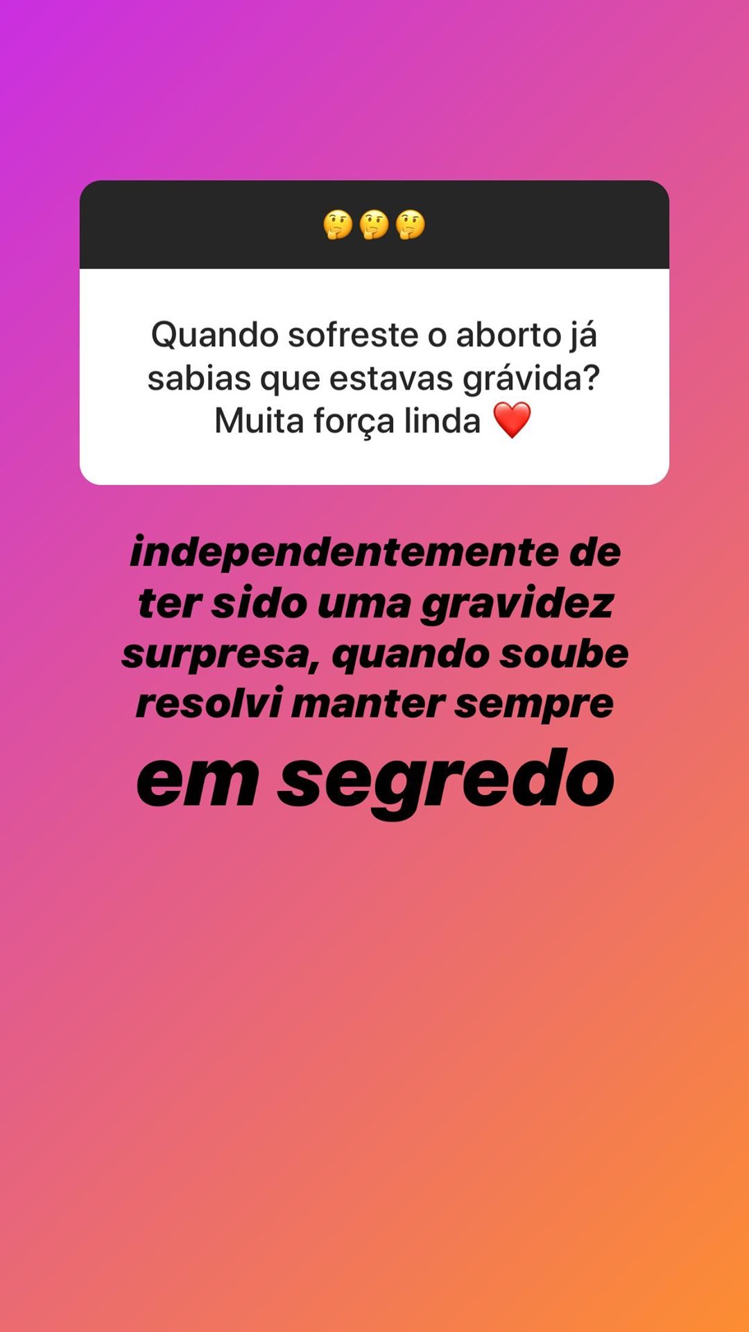 De acordo com as respostas, a jovem revelou que já sofreu três abortos, mas não quis dar detalhes sobre esse passado: “Antes que perguntem não vou falar sobre tal. O que mais me custou foi com o Bruno, porque é o homem com quem tenciono ficar para o resto da minha vida e é um sonho para nós [serem pais]”.