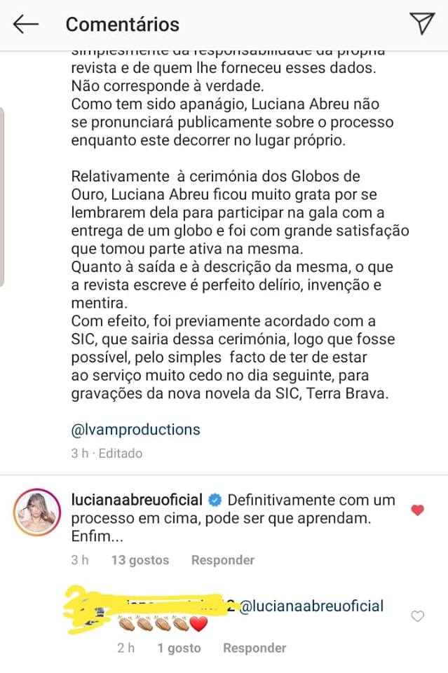 Mais tarde, no facebook da sua agência, Luciana comentou a publicação onde falam desse mesmo episódio, afirmando que 2com um processo em cima, pode ser que aprendam”.