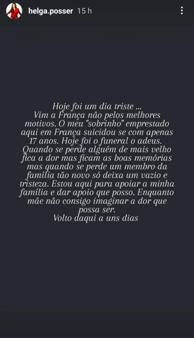 Na legenda da partilha podemos ler: “Hoje foi um dia triste… Vim a França não pelos melhores motivos. O meu “sobrinho” emprestado aqui em França suicidou-se com apenas 17 anos. Hoje foi o funeral, o adeus”.