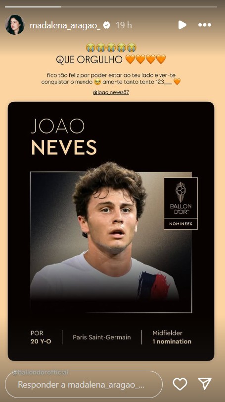 Neste dia 7 de agosto, quinta-feira, Madalena Aragão, recorreu às suas redes sociais onde reagiu à nomeação de João Neves para a Bola de Outro.