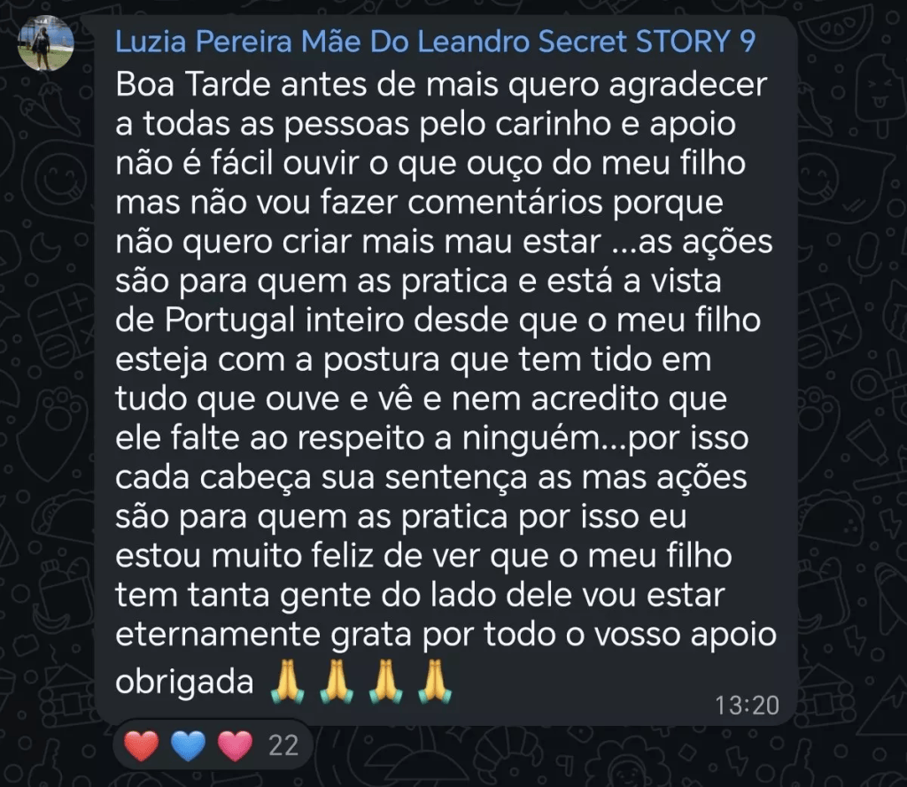 Em resposta à situação, a mãe de Leandro recorreu a um grupo de WhatsApp de apoio ao filho. Emocionada, agradeceu o carinho dos seguidores e destacou a postura do concorrente: “Não é fácil ouvir o que ouço sobre o meu filho, mas não vou fazer comentários porque não quero criar mais mau-estar… As ações são para quem as pratica e está à vista de Portugal inteiro.”