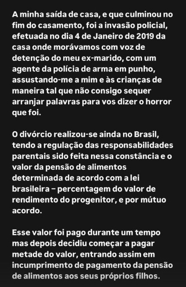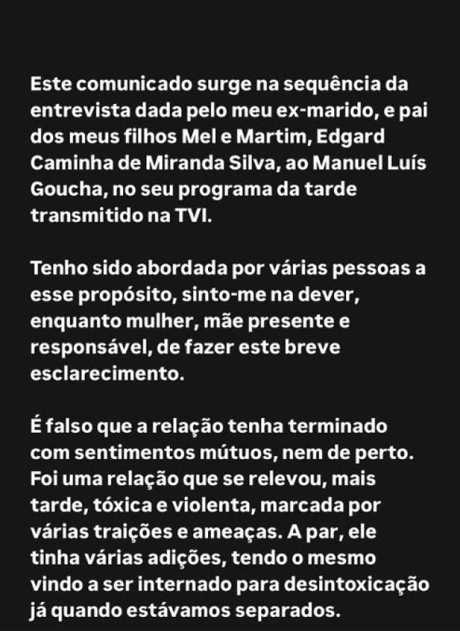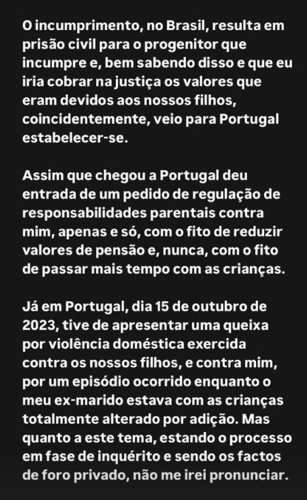 No comunicado partilhado nas redes sociais, a atriz e influencer informou que apresentou uma queixa contra o ex-companheiro no ano passado. “Já em Portugal, a 15 de outubro de 2023, tive de apresentar uma queixa por violência doméstica contra os nossos filhos e contra mim, devido a um episódio ocorrido quando o meu ex-marido estava com as crianças completamente alterado devido à adição. No entanto, como o processo está em fase de inquérito e os factos são privados, não vou fazer mais comentários”, afirmou.