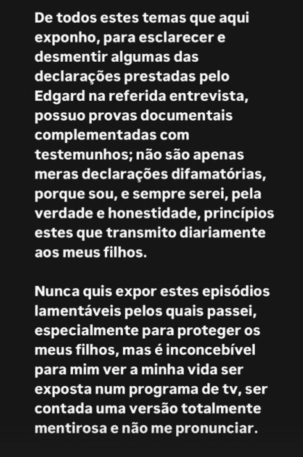 “Tenho provas documentais que contradizem algumas declarações feitas pelo Edgard na referida entrevista, não são apenas acusações difamatórias, pois a verdade e honestidade são valores que transmito diariamente aos meus filhos”, acrescentou.