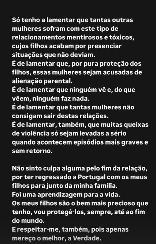 “Não me sinto culpada pelo fim da relação nem por ter regressado a Portugal com os meus filhos para estar perto da minha família. Foi uma lição de vida. Os meus filhos são o que tenho de mais precioso, vou protegê-los sempre. E também respeitar-me, pois mereço apenas o melhor, a verdade”, concluiu.