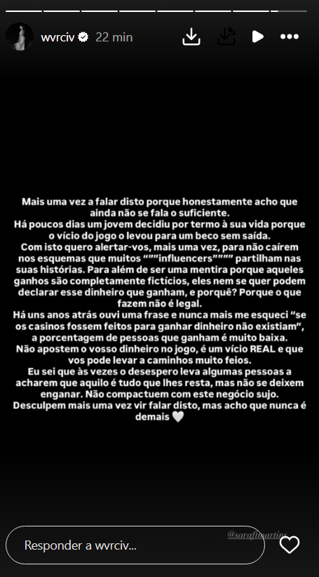 “Não apostem o vosso dinheiro, o jogo é um vício real e pode arruinar a vossa vida. Eu entendo que às vezes o desespero fala mais alto, mas não se deixem enganar. Há sempre outro caminho. Não compactuem com isto.”