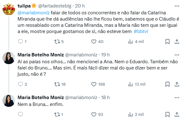 Ao que apresentadora respondeu: “Ai as palas nos olhos… não mencionei a Ana [Duarte]. Nem o Eduardo [Ferreira]. Também não falei do Bruno [de Carvalho]…. Mas sim. É mais fácil dizer mal do que dizer bem e ser justo, não é? Nem a Bruna… enfim“.