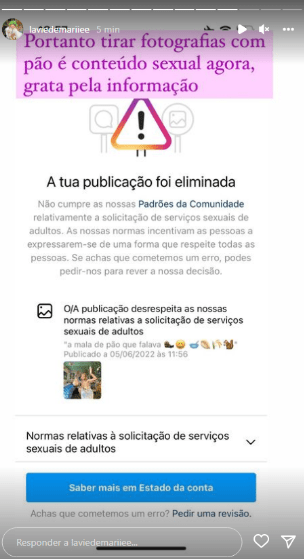 “A tua publicação foi eliminada. Não cumpre os nossos padrões de comunidade relativamente à solicitação de serviços sexuais e adultos (…)”, pode ler-se.