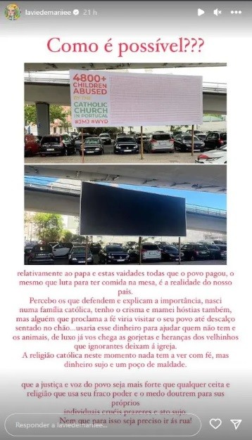 “Percebo os que defendem e explicam a importância, nasci numa família católica, tenho o crisma e mamei hóstias também […] A religião católica, neste momento, nada tem a ver com fé, mas dinheiro sujo e um poço de maldade”, apontou Marie. “Que a justiça e voz do povo seja mais forte do que qualquer seita e religião que usa o seu fraco poder e o medo de outrem para os seus próprios individuais cruéis prazeres e ato sujo. Nem que para isso seja preciso ir às ruas”, apelou ainda a ex-concorrente do ‘BB Famosos’.