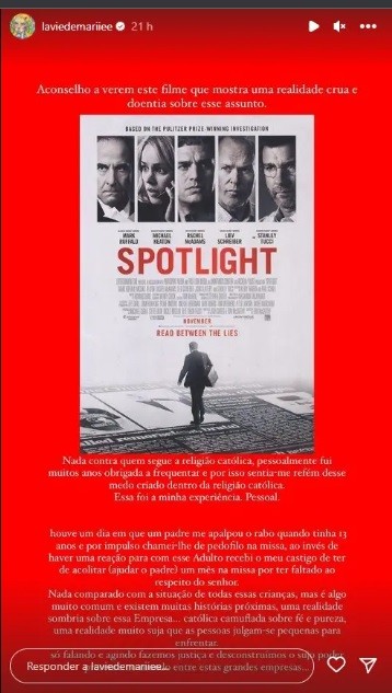 “Ao invés de haver uma reação para com esse adulto, recebi o meu castigo de ter de acolitar (ajudar o padre) um mês na missa por ter faltado ao respeito do senhor. Nada comparado com a situação de todas essas crianças, mas é algo muito comum e existem muitas histórias. Uma realidade sombria sobre essa empresa católica camuflada sobre fé e pureza. Uma realidade muito suja que as pessoas julgam-se pequenas para enfrentar. Só falando e agindo fazemos justiça e desconstruímos o sujo poder presente no mundo entre estas grandes empresas”, concluiu Marie.