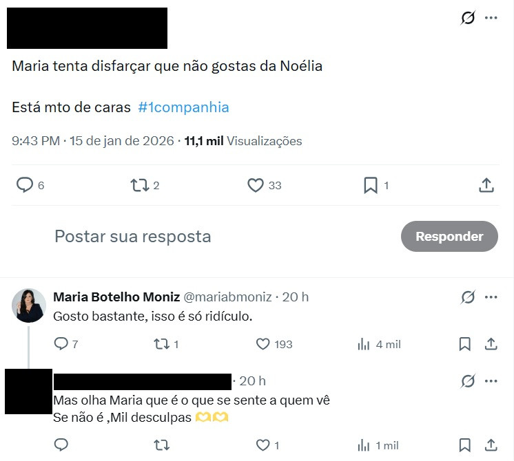 Maria Botelho Moniz esteve ativa na rede social X, esta quinta-feira, dia 15 de janeiro, ao responder a uma crítica deixada por um internauta sobre a sua atitude no reality show 1ª Companhia.
