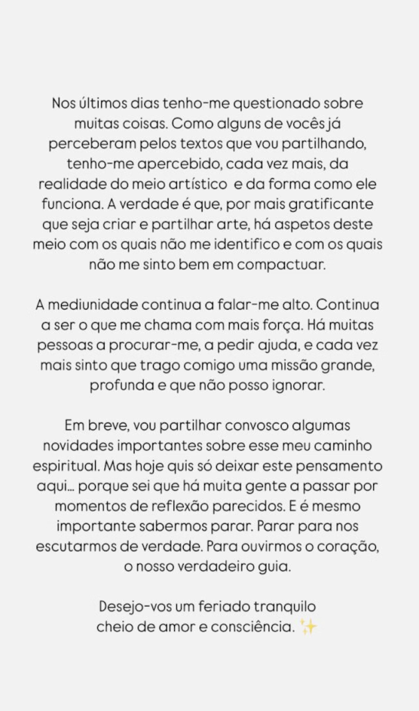 No meio do desabafo, surge uma revelação serena mas poderosa: a espiritualidade está a ocupar cada vez mais espaço na sua vida. “A mediunidade continua a falar-me alto. Continua a ser o que me chama com mais força”, partilhou. E quando a alma escuta esse chamamento, não há como ignorar. Ele sente-se procurado, convocado até, por quem precisa de luz e orientação. E isso tem-se tornado impossível de negar ou adiar.