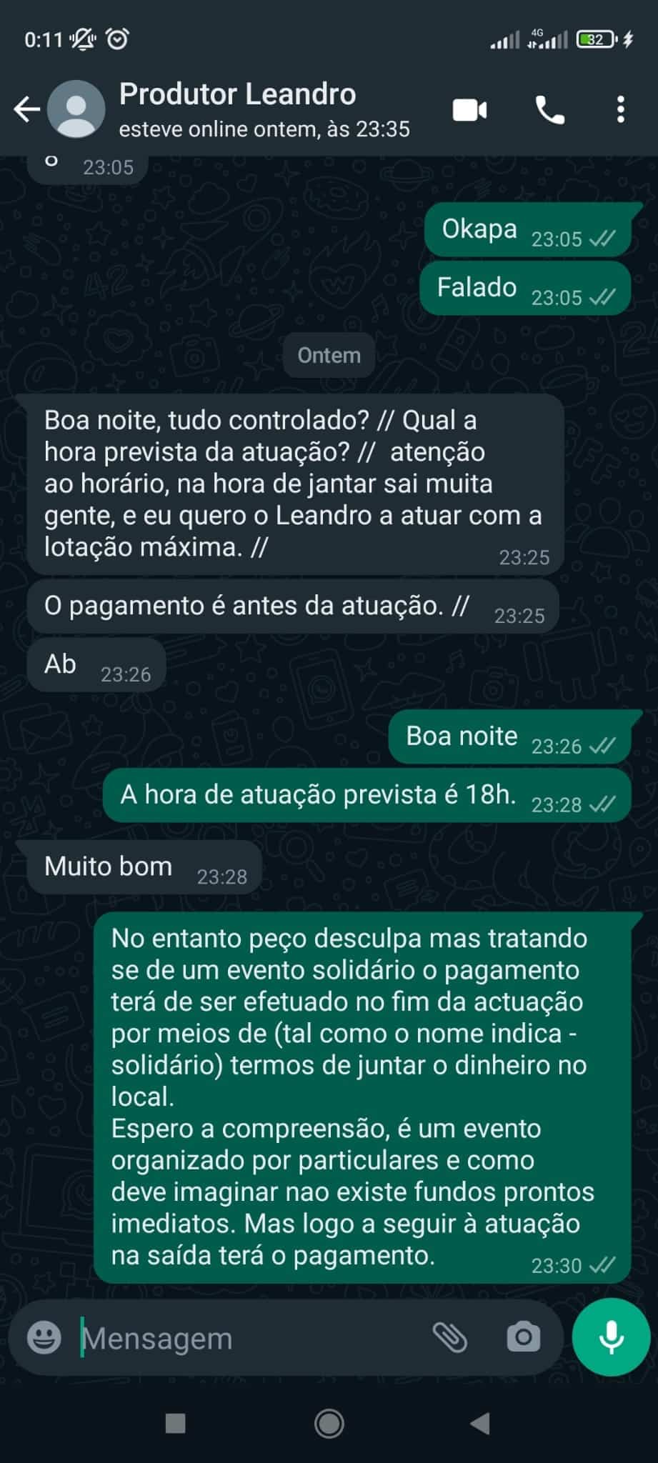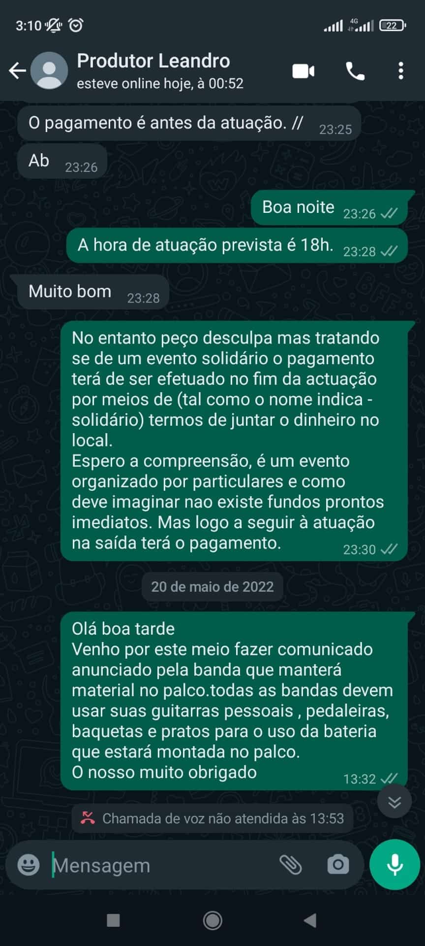 “No entanto, no local, foi pedido o pagamento antes da atuação, e conforme mencionado anteriormente e sem qualquer recusa da outra parte, ressaltamos que o pagamento apenas iria ser realizado no final. Posto tal, por os motivos (que nem nós sabemos) o cantor e seus músicos se recusaram a atuar por não receberam o seu cachê antes”, disseram ainda.