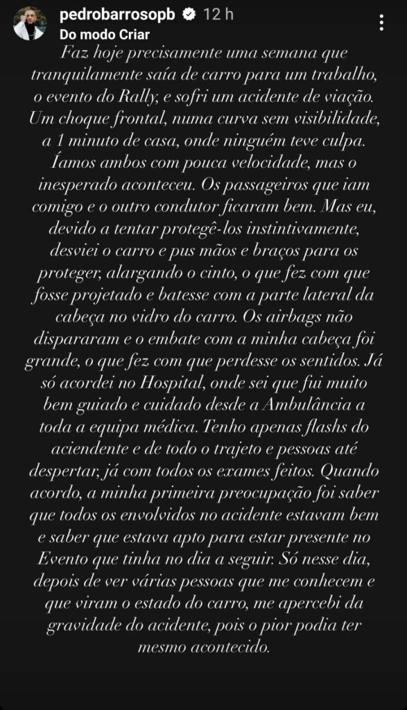 Ainda disse que ficou sem sentidos: “Já só acordei no Hospital, onde sei que fui muito bem guiado e cuidado desde a Ambulância a toda a equipa médica. Tenho apenas flashs do acidente e de todo o trajeto e pessoas até despertar, já com todos os exames feitos. Quando acordo, a minha primeira preocupação foi saber que todos os envolvidos no acidente estavam bem e saber que estava apto para estar presente no Evento que tinha no dia a seguir. Só nesse dia, depois de ver várias pessoas que me conhecem e que viram o estado do carro, me apercebi da gravidade do acidente, pois o pior podia ter mesmo acontecido“.