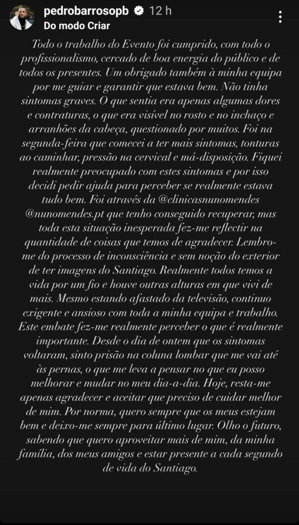 “(…) Realmente todos temos a vida por um fio e houve outras alturas em que vivi de mais. Mesmo estando afastado da televisão, continuo exigente e ansioso com toda a minha equipa e trabalho. Este embate fez-me realmente perceber o que é realmente importante. Desde o dia de ontem que os sintomas voltaram, sinto prisão na coluna lombar que me vai até às pernas, o que me leva a pensar no que eu posso melhorar e mudar no meu dia-a-dia“, concluiu.