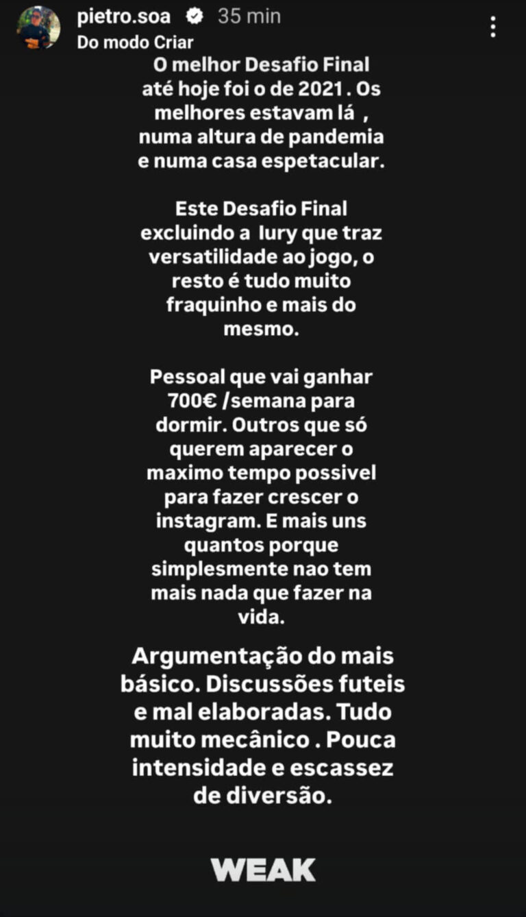 O ex-concorrente Pedro Soá usou as suas redes sociais para criticar de forma incisiva a edição atual do ‘Desafio Final’.