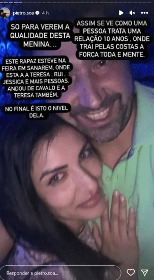 Pedro Soá, após a mensagem da ex-namorada, partilhou nas redes sociais o “novo amor” de Ana: “Só para verem a qualidade desta menina. Assim se vê como uma pessoa trata uma relação de 10 anos. Onde trai pelas costas à força toda e mente. Este rapaz esteve na feira em Santarém, onde estava a Teresa, Rui, Jéssica e mais pessoas. Andou a cavalo e a Teresa também. No final é isto o nível dela”.