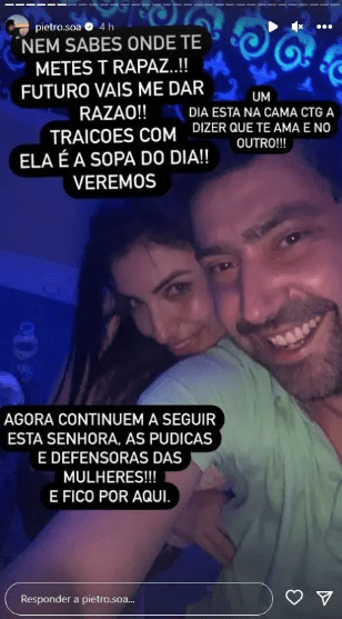 O ex-concorrente ainda disse: “Nem sabes onde te meteste rapaz!! No futuro vais me dar razão!! Traições com ela é a sopa do dia!! Veremos. Um dia está na cama contigo a dizer que te ama e no outro… Agora continuem a seguir esta senhora, as púdicas e defensoras das mulheres!!!”.