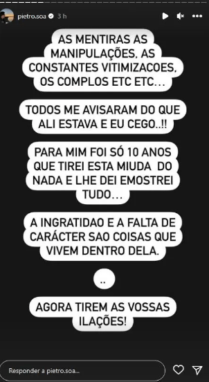 Rematou ainda: “As mentiras, as manipulações, as constantes vitimizações, os complôs. Todos me avisaram do que ali estava e eu cego! Para mim foi só 10 anos que tirei esta miúda do nada e lhe dei e mostrei tudo. A ingratidão e falta de caráter são coisas que vivem dentro dela. Agora tirem as vossas ilações”.