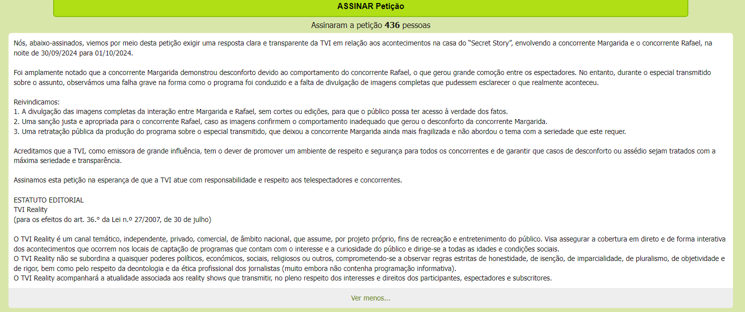 “Exigimos transparência e ação no caso de desconforto da concorrente Margarida no Secret Story” é o título da petição, que começa por explicar: “Nós, abaixo-assinados, viemos por meio desta petição exigir uma resposta clara e transparente da TVI em relação aos acontecimentos na casa do Secret Story, envolvendo a concorrente Margarida e o concorrente Rafael, na noite de 30/09/2024 para 01/10/2024“.