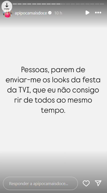 “Pessoas parem de enviar-me os looks da festa da TVI, que eu não consigo rir de todos ao mesmo tempo”, atirou.