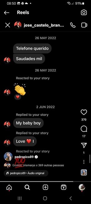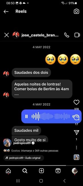 “Aqui nestas capturas de ecrã enviadas pelo Zé para o meu Instagram podem ver que ele tem ‘saudades’ de nós juntos, pede para dormir comigo. Tenho centenas de áudios do Zé a dizer que gostaria de viver comigo, casar comigo e viver nesta casa porque o plano dele é esse, viver nesta casa, mas não vai viver nesta casa”, assegura Pedro Pico.