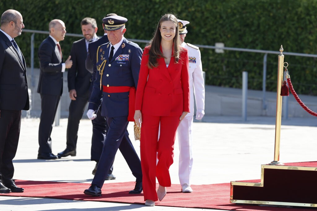 A escolha recaiu num fato vermelho da marca Carolina Herrera, composto por um blazer (no valor de 790 euros) e calças a combinar (que custam 390 euros), segundo a revista Hola!.