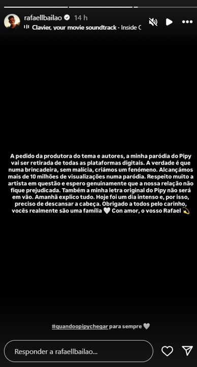 Neste sábado, 8 de fevereiro, Rafael Bailão recorreu ao seu Instagram para comunicar que a sua paródia “Quando o Pipy Chegar”, que fez sucesso nas redes sociais, será retirada de todas as plataformas digitais. O cantor e influenciador digital explicou que a decisão foi tomada a pedido da produtora da música e dos autores.