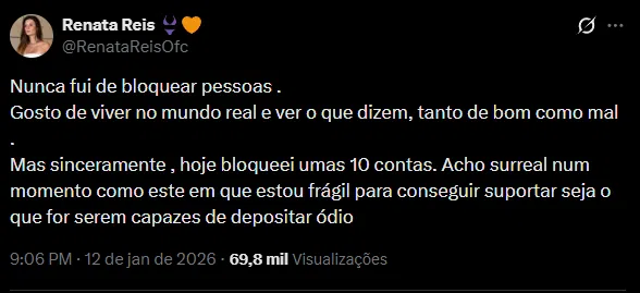 A ex-concorrente da Casa dos Segredos utilizou a rede social X (antigo Twitter) para expressar a sua incredulidade perante a falta de empatia de algumas pessoas. “Mas sinceramente, hoje bloqueei umas 10 contas”, confessou Renata, assumindo que chegou a um ponto de rutura emocional. A jovem sublinha que esta atitude surge como uma forma de autoproteção num período de extrema fragilidade.