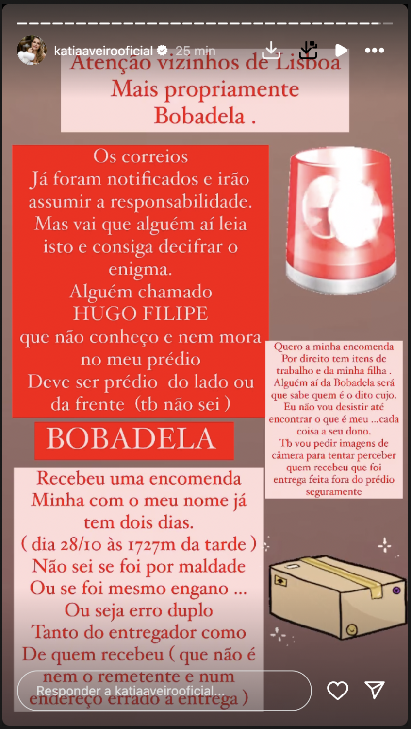 Na manhã de quarta-feira, 30 de outubro, ela explicou que uma encomenda feita para sua casa em Lisboa foi entregue a uma pessoa chamada Hugo Filipe, que ela não conhece e que aparentemente não mora no seu prédio. “Receberam uma encomenda minha com o meu nome há dois dias”, relatou.