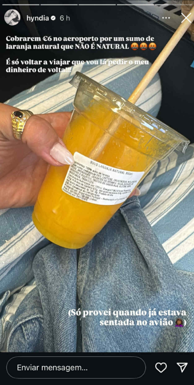 A artista pagou cerca de 6 euros por um sumo de laranja natural, mas acabou por se sentir enganada: “Cobram 6€ no aeroporto por um sumo de laranja natural que não é natural!”, escreveu. Acrescentou ainda, entre risos e indignação: “Só provei quando já estava sentada no avião. É só voltar a viajar que vou lá pedir o meu dinheiro de volta!!!”