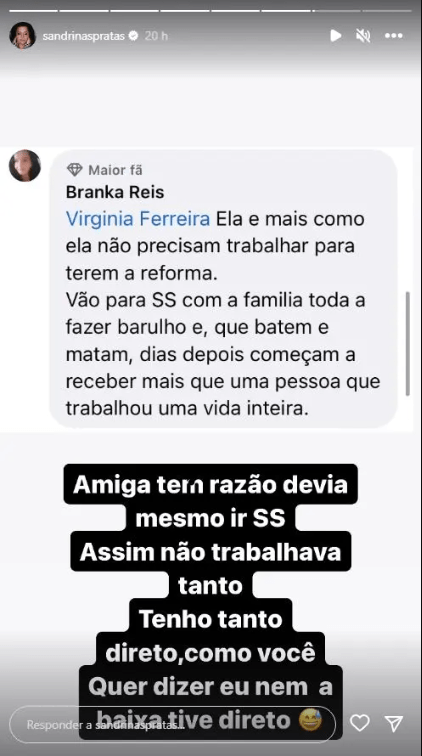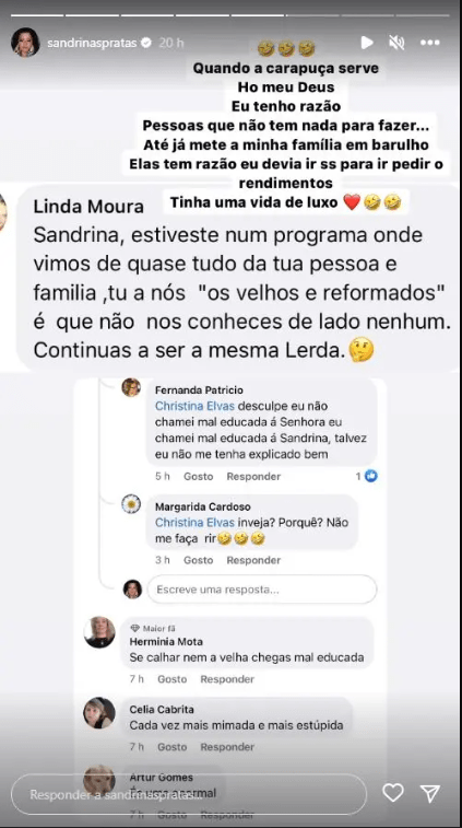 Após denunciar comentários de ódio de “velhos e velhas”, como a própria referiu, Sandrina Pratas voltou a responder às críticas: “Ela e mais como ela, não precisam de trabalhar para terem reforma. Vão para a Segurança Social com a família toda a fazer barulho e, que batem e matam, dias depois começam a receber mais que uma pessoa que trabalhou a vida inteira” – escreveu uma internauta.