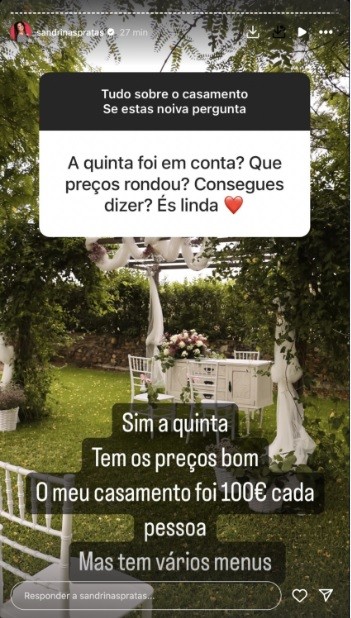 E ela até revelou o preço por cabeça que pagou na quinta: “O meu casamento foi 100€ cada pessoa”.